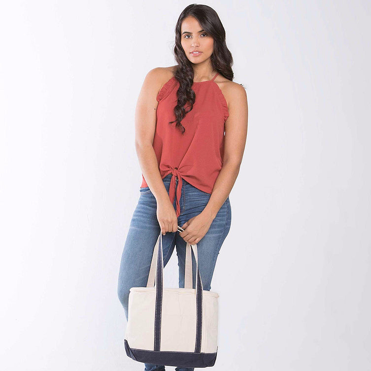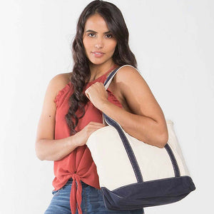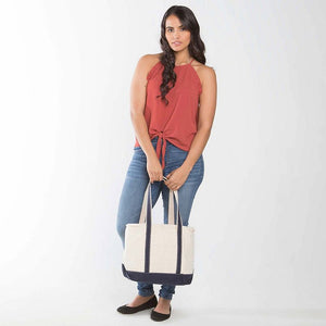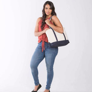 Each bag is made from 12 oz. canvas with reinforced canvas handles. The natural color canvas exterior is accented in navy contrasting trim at the bottom and along the handles. Top zip closure with front exterior pocket.