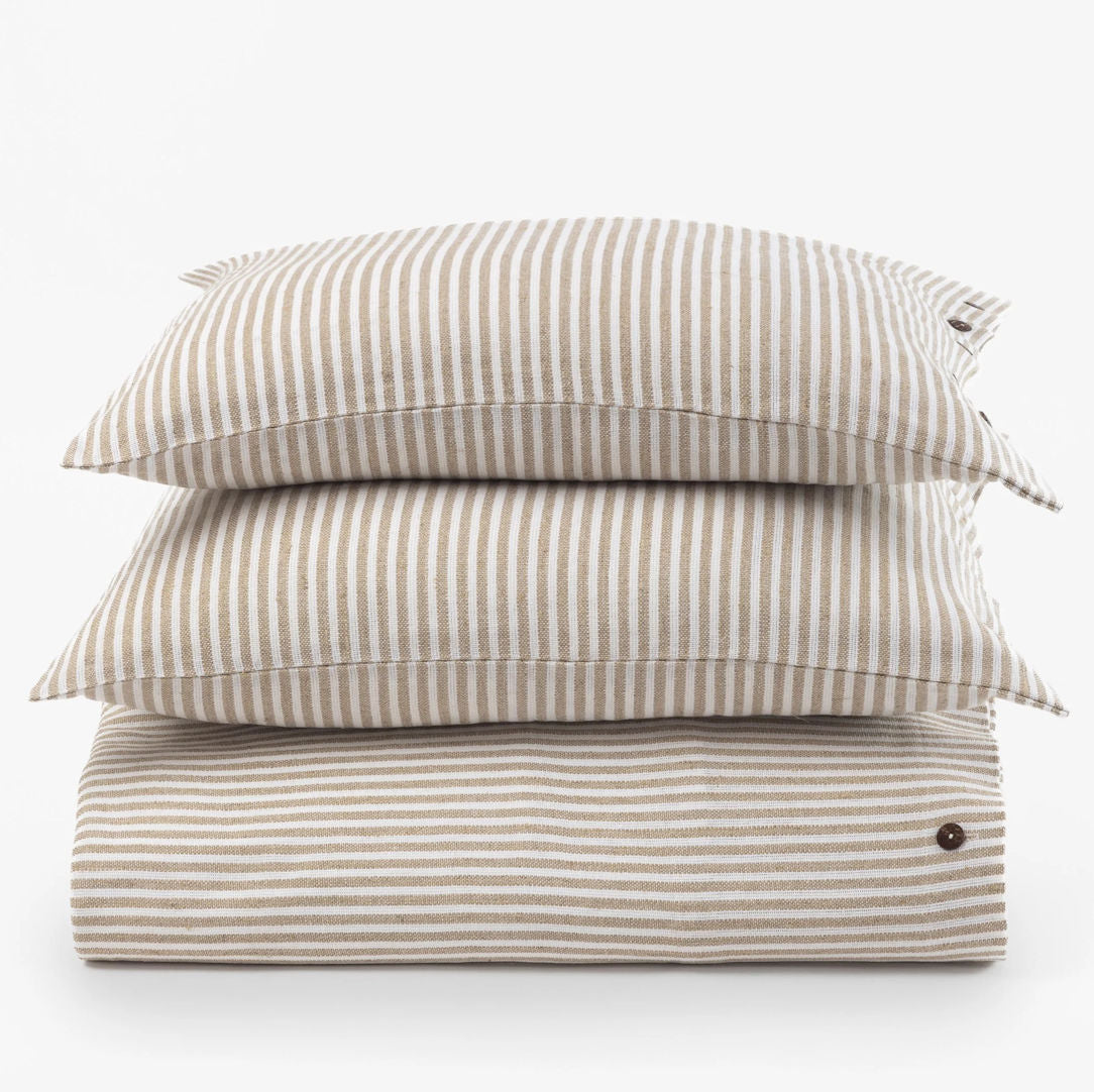 STRIPED LINEN DUVET COVER: Striped Duvet Cover is made of Linen 55% Cotton 45%. Shown here folded at the foot of the bed, this heavy fabric duvet cover can also be used without a duvet inside, as a bed scarf or coverlet. Features beautiful exposed coconut shell buttons.