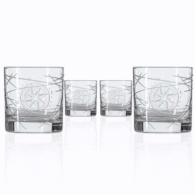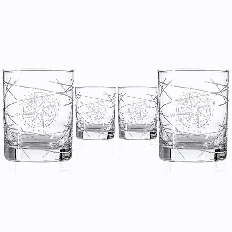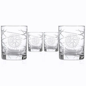 A compass rose is the navigational marker traditionally used on maps to indicate direction. It is the inspiration behind our elegant Ocean Navigator barware. Both the smaller 11 oz. Whiskey Tumblers and the larger 13 oz. Double Old-Fashioned Tumblers are made of European mouth-blown, lead-free crystal, sand etched with a linear latitude/longitude and compass rose pattern.
