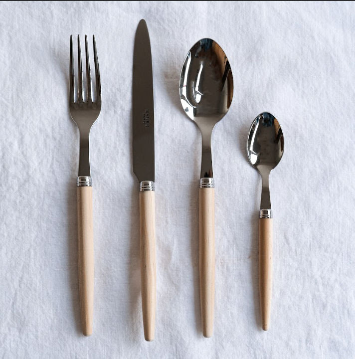 The minimalist look of the Sabre Jonc Light Wood and Dark Wood punta retro inspired flatware creates a sophisticated tone for your beach house or onboard table. This eco-friendly wood handles are created from sustainable Radiata Pine. Available in your choice of dark or light wood, the wood handles are extremely durable, allowing for safe dishwasher use. Each piece is crafted in France of the finest materials, paired with 18/10 stainless steel.