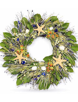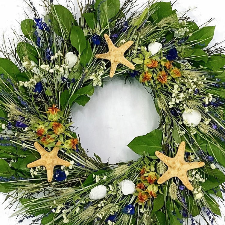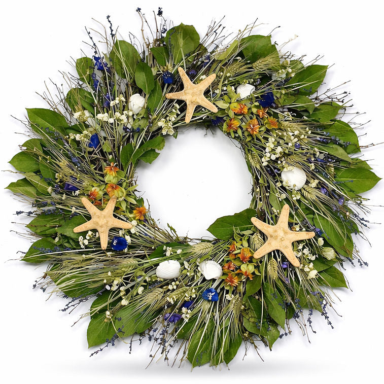 Add a rustic, natural coastal touch to your beach house, with our Big Sur Beach Preserved Coastal Wreath. Real, knobby starfish and sun bleached shells are nestled among preserved green Salal leaves, Bear Grass and wheat, with Paras Pods, Safflower, Lavender and Larkspur accents. Made in USA. Wreath is available in a standard 20" diameter, suitable for most doors.
